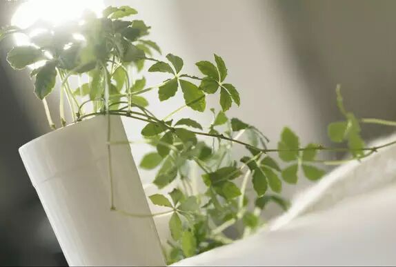 在客厅正中的茶几上,用透明的器皿养水生的绿萝,有助于提升财运指数。